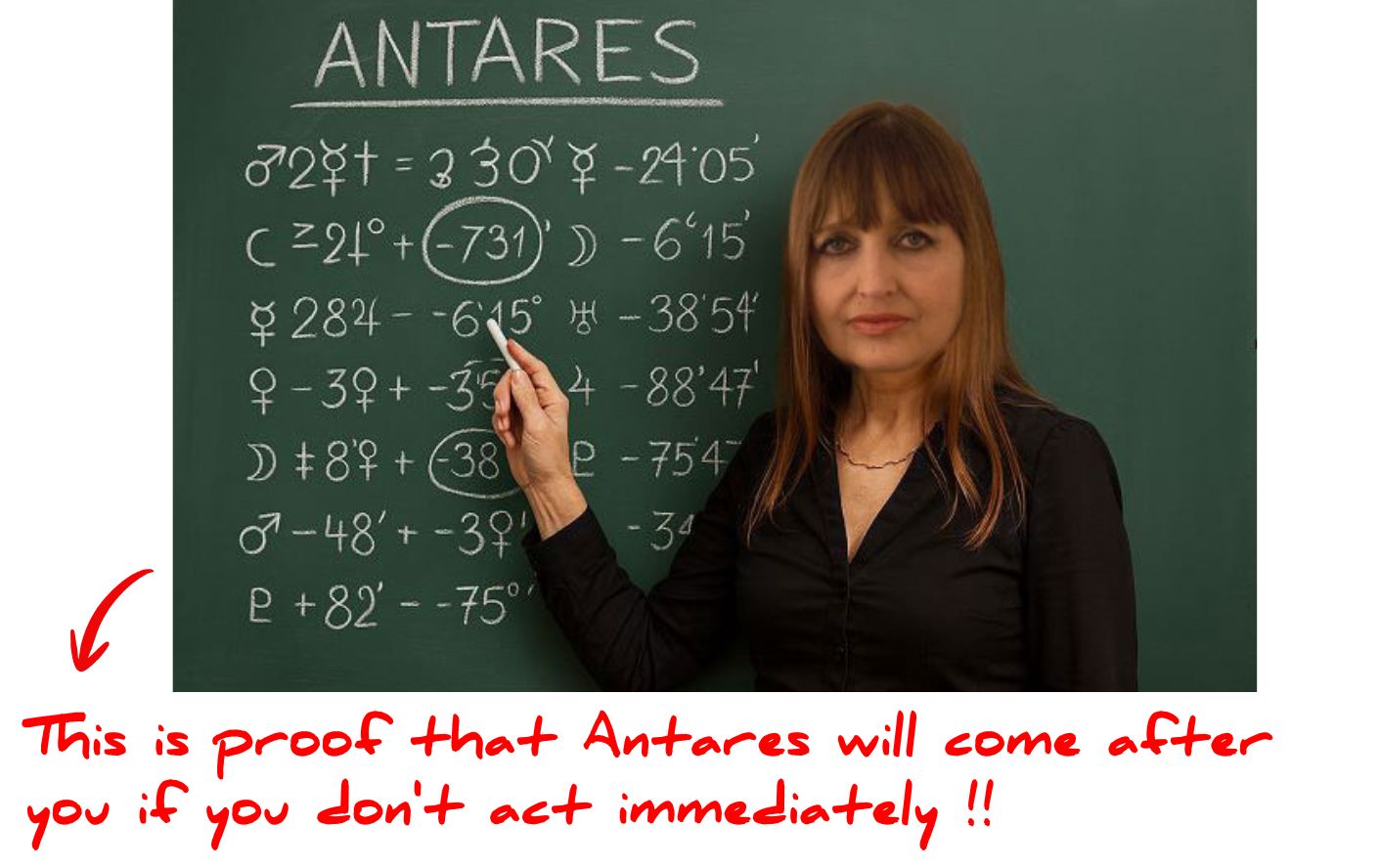 You can’t imagine how evil this star is, even I’m afraid of it when I know it’s about to appear. On top of that, you are Aries of the Third Decan and you were born on April, 19th 1967. Which means that at the exact second you were born, the planets were aligned with the star Antares, so every time it appears it affects you more than the rest of the world. Indeed look, I can even prove it with the calculations I have just made on my board, that you are in great danger: